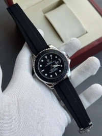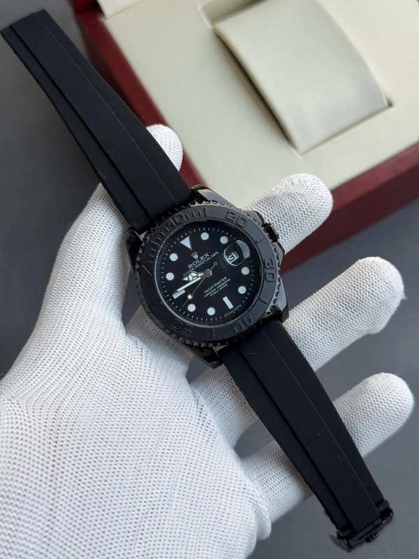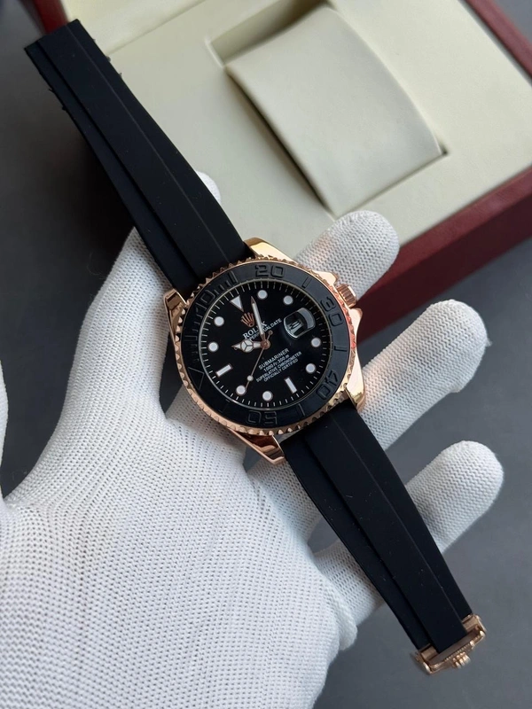 Premium men’s luxury watch with black fiber belt and high-quality gold & copper dial. Features quartz movement, working date, sapphire glass, and Rolex lock.