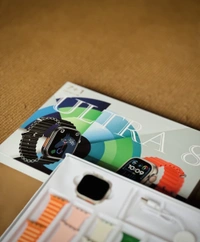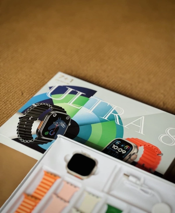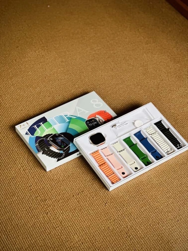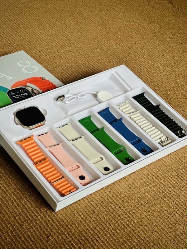 Smartwatch with BT calling, customizable wallpaper, wireless charging, and full health suite including heart rate, BP, SpO₂, sleep tracking, pedometer, and body temperature. Features multi-sport modes, message notifications, music control, camera remote, alarms, stopwatch, auto light screen & more. Comes with 7 premium interchangeable straps.